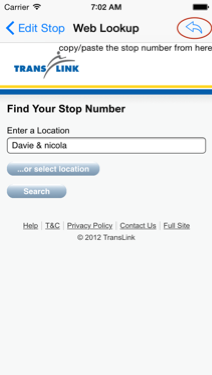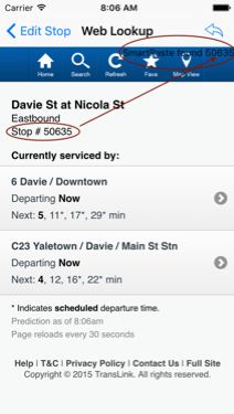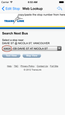 The first time you launch My Bus Times, change your default region in the Edit Stop screen to Vancouver by tapping on the San Francisco Bay Area button in the middle of your screen. Choose Vancouver, BC. If you’re standing in front of a bus stop sign where the stop number is posted, enter the 5 digit number you see on that sign. Otherwise, follow the steps below to look up your departure stop, provided you know the route and intersection you’re departing from. If you transfer to other buses, you will want to save those boarding locations as well.