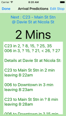 Once that's done, whenever you open the app on your iPhone or Apple Watch, choose your stop and real-time arrivals of all routes at that stop appear instantly! Confused by the ? and < in the predictions? Edit stop gives you a key. In the above example, a scheduled stop 8 minutes from now with no GPS to back it up will show as “? 8”. That bus might arrive earlier or later or not at all. A GPS report from a bus that will arrive in fewer than the scheduled 26 minutes will report “< 26” so get there early.