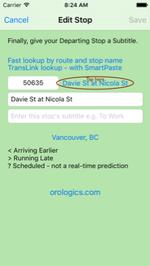 4. The new SmartPaste feature detects when you are at the website’s arrival predictions page and will automatically copy/paste the stop number when you tap Edit Stop to return. Now it’s time to fill in a title and subtitle to identify this stop. Tapping the stop name will automatically copy it to the title. You can fill in a subtitle or leave it blank and fill it in another time.