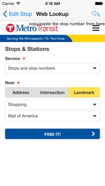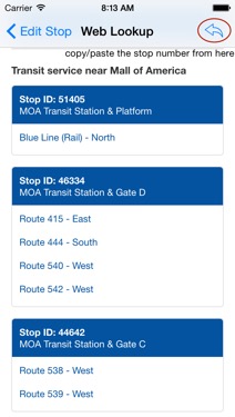 The first time you launch My Bus Times, change your default region in the Edit Stop screen to the Twin Cities by tapping on the San Francisco Bay Area button in the middle of your screen. Choose Minneapolis / St Paul. If you’re standing in front of a bus stop sign where the stop number is posted, enter the 5 digit number you see on that sign. Follow the steps below to look up your departure stop, provided you know the route and intersection you’re departing from. If you transfer to other buses, you will want to save those boarding locations as well. This app will not be asking for your destination.